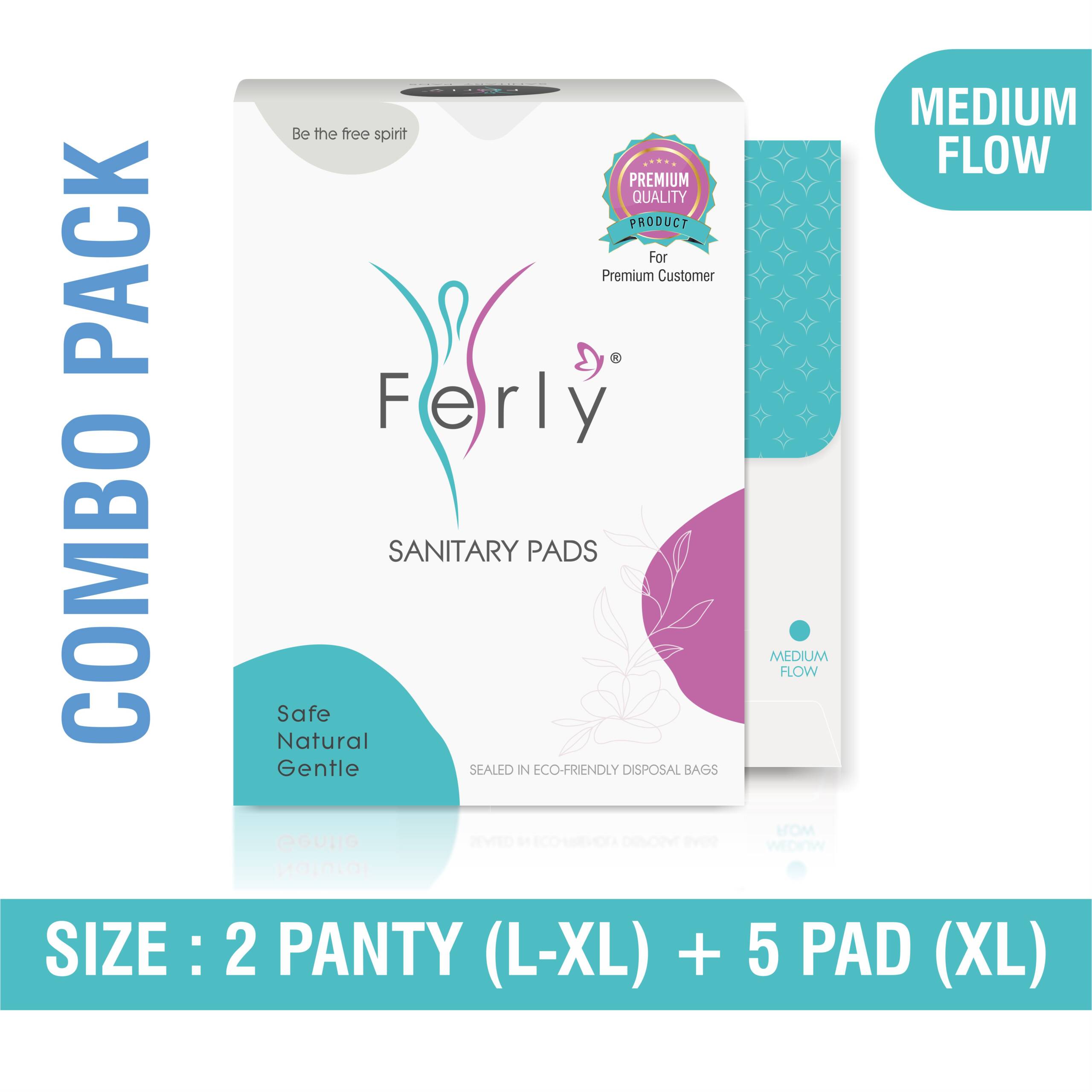 CONTENTS: Each pack includes ferly Period Care panty 2 (L-XL) and pads 5 (XL) Sanitary Pads enriched with Neem and Safflower.