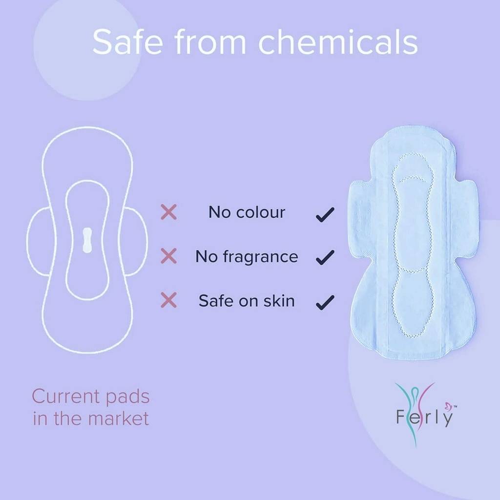 These ferly Period Care sanitary napkin pads come in an easy-to-carry pack with a convenient top-handle and have been manufactured using fully automated, touchless processes at one of India’s most sophisticated, ultra-modern and hygienic manufacturing units compliant with ISO 9001-2015, WHO-GMP and CE Marking. These skin friendly sanitary pads are safe and do not contain any bleaching, inks, latex, chlorine or phthalates.