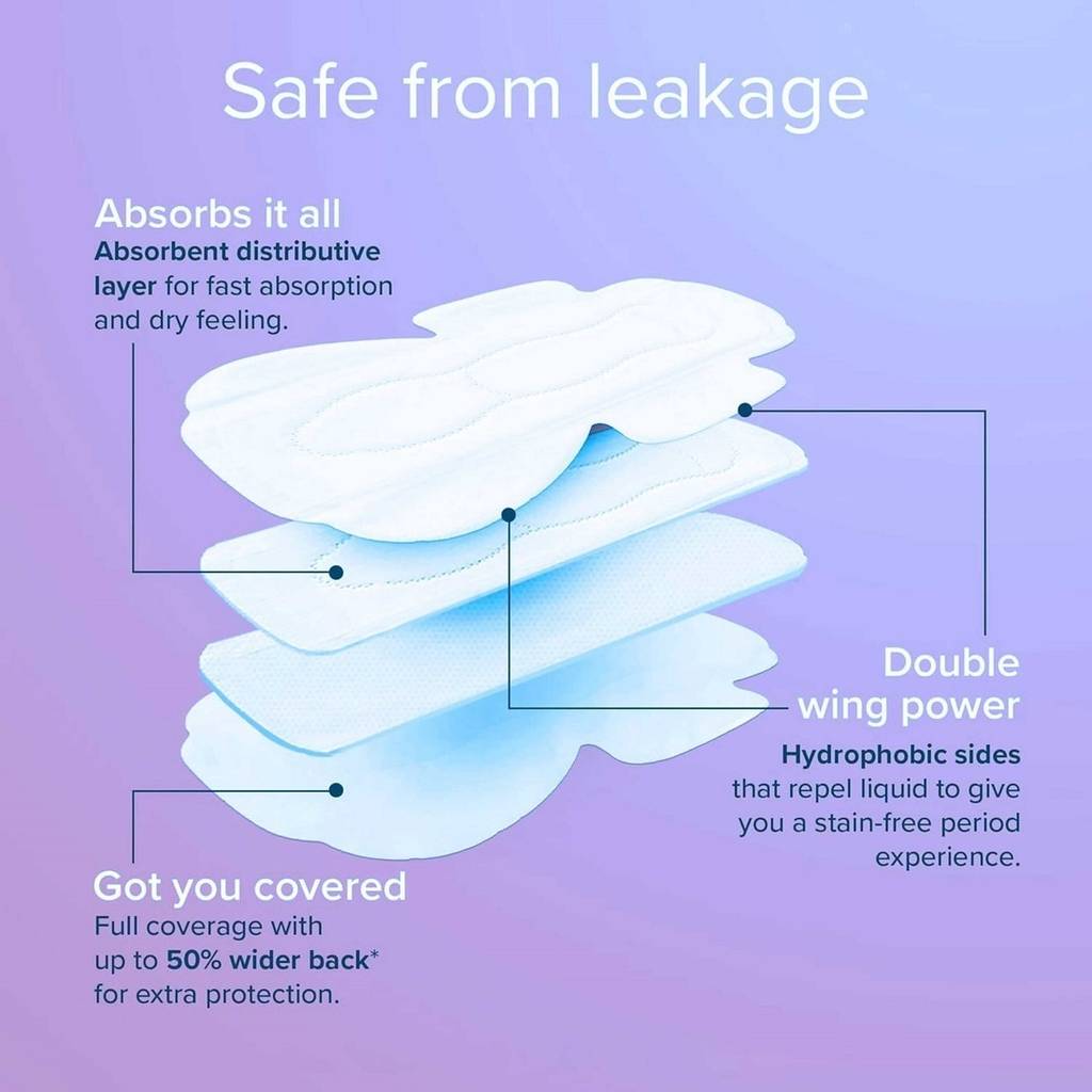 These 320mm long premium period pads offer 2x faster absorption for long lasting protection in comparison to fluff-only pads. The double flap system in these ferly sanitary napkins gives you a better grip to keep the pad in place even during prolonged use. Extra wide back helps provide more coverage and security. Wetness lock technology ensures no odour or leakage.